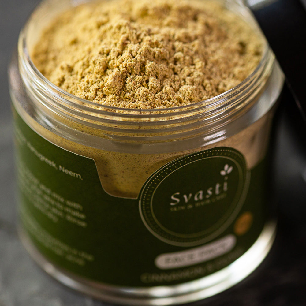 “My stressful life, screen time definitely takes a toll on my skin and I rely on Svasti’s products as a safe fall back to self care. I use the Sandalwood facepack with their coconut oil, the HEMP scrub, and am always left feeling good with a glow and reduced effects of tanning”